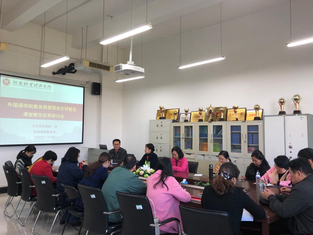 根据学校《关于开展新时代教育思想观念大讨论的通知》精神和《米兰milan官方网站新时代教育思想观念大讨论活动安排》要求,大学英语教研一室、后续课程教研室于11月8日下午在524会议室联合召开了课堂教学改革专题研讨会,米兰milan官方网站副院长许海兰教授、教研室全体老师、部分专兼职教师代表参加了会议。会议由大学英语教研一室主任吴国权老师主持。