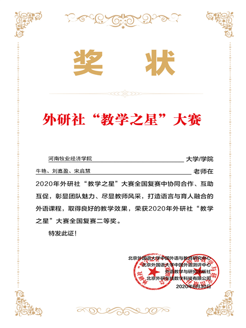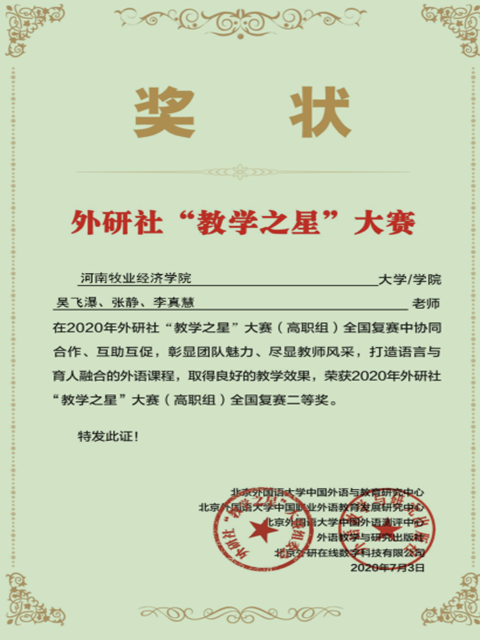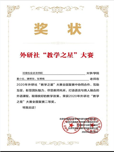 2020年米兰milan官方网站师资培训以“语言与育人融合的外语课堂教学设计”为中心,结合信息技术对语言教学的影响和促进,展开课堂教学设计的研讨与评比。5月,米兰官网选拔组建三个教师团队参加2020年外研社“外研之星”教学大赛,在全国复赛阶段,米兰官网以姜小红、谭明华、张明梅组成的团队获得英语类专业组二等奖,以牛艳、宋启慧、刘嘉盈组成的团队获得大学英语组二等奖,以吴飞瀑、张静、李真慧组成的团队获得高职组二等奖。6-7月,米兰官网组织了全体教师参加了米兰官网2020年度教学技能竞赛,各教研室围绕“上好一节课”进行线上集体研讨,相互听课评课,推选出三名教师参加学校教学技能比赛,最终韩淑俊获得在全校比赛中获得一等奖,崔海飞获得三等奖。在河南省本科教育线上教学优秀课程评选活动中,米兰官网杨柳、吴国权、刘燕、宋一然组成教学团队的《大学英语4》和赵阳、许海兰、温晶晶、韩淑俊组成的教学团队的《英语写作》两门课程获得河南省本科教育线上教学优秀课程二等奖。