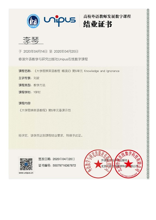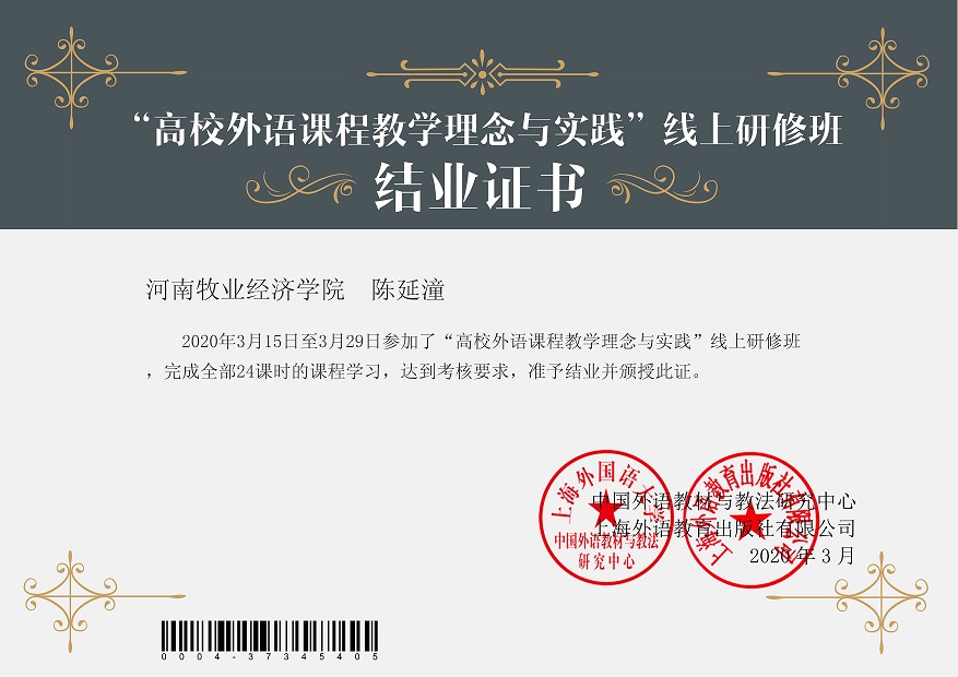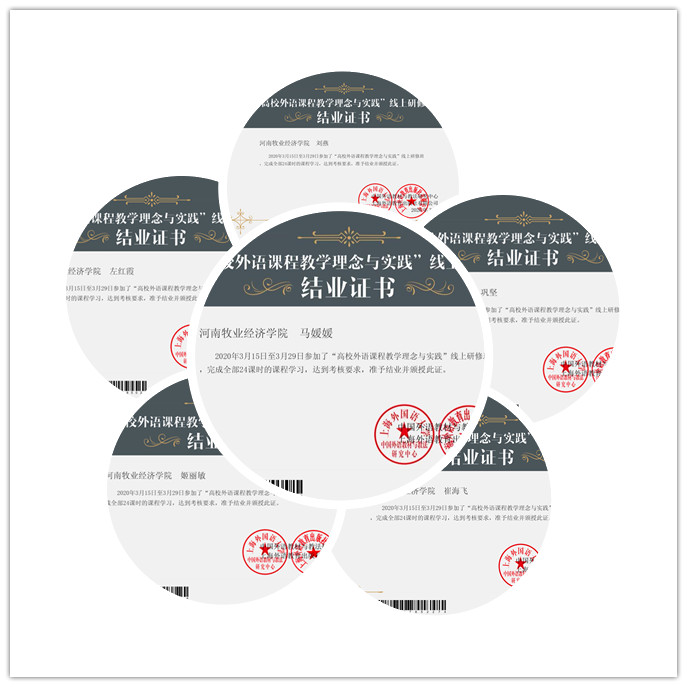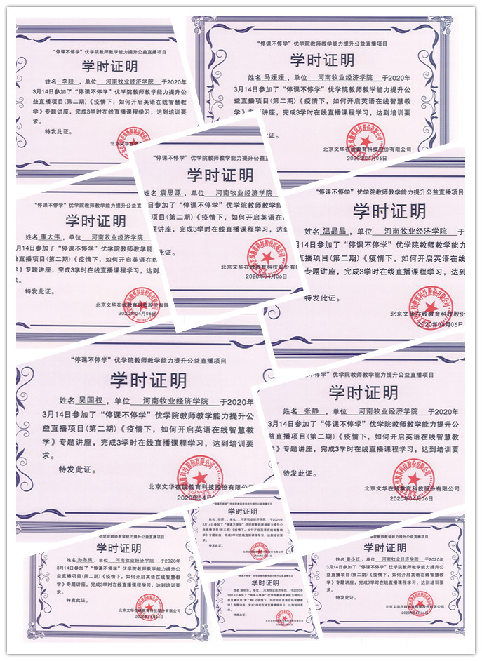 疫情期间,米兰milan官方网站共组织教师参加了42场讲座培训,由于上课等原因错过直播的老师也观看了回放,有65名教师通过培训考核,获得证书。米兰milan官方网站精心组织,讲座前有通知、海报,预告讲座要点,讲座中实时发言讨论,讲座后研讨总结。突如其来的教学模式变化给大家带来了前所未有的挑战与全新体验,通过系统的培训与学习,教师们由疫情初期的仓促上阵,到逐步适应、熟练应用,米兰milan官方网站的网络教学得到了学生的肯定与欢迎,在河南省本科教育线上教学优秀课程评选活动中,米兰milan官方网站的《大学英语4》和《英语写作》两门课程通过米兰官网遴选,推荐到省教育厅参与本科教育线上教学优秀课程评选。