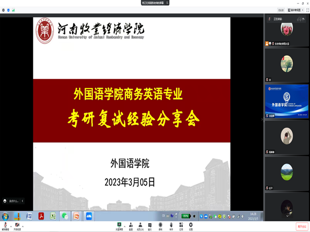 为助力2023届商务英语专业毕业生考研复试备考,米兰milan官方网站于3月5日召开了线上分享会,邀请了部分硕士在读的优秀毕业生带来考研复试的经验及建议。学院领导、部分专业课教师及拟参加复试的学生参加了会议。会议由商务英语教研室主任张明梅主持召开。