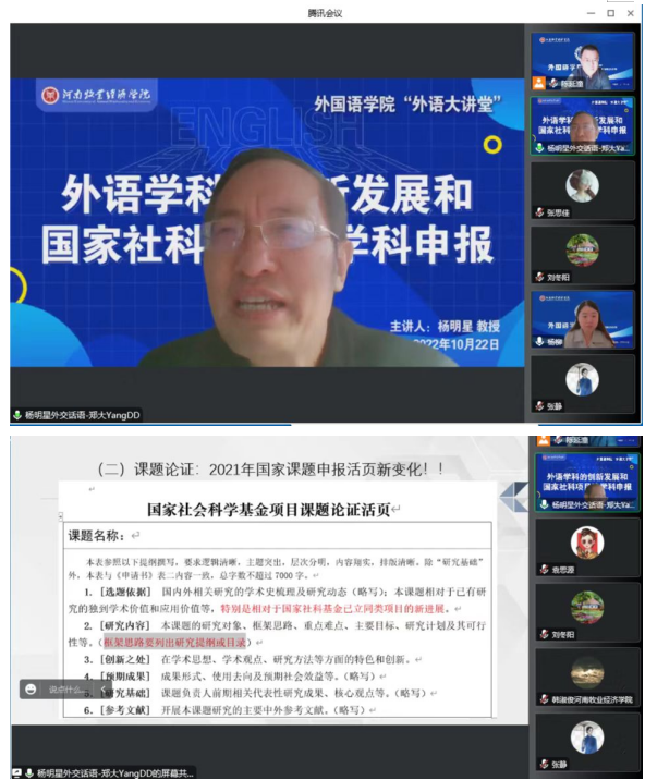 2022年10月22日上午,米兰milan官方网站特邀郑州大学中国外交话语研究院院长、外国语与国际关系学院副院长、国家社科基金重大项目首席专家及评审专家杨明星教授做《外语学科的创新发展和国家社科项目跨学科申报》为主题的学术报告。米兰milan官方网站院长陈延潼,副院长马媛媛、巩坚、闻华及米兰milan官方网站全体教师参加了会议。会议由院长陈延潼主持,采用线上形式展开。