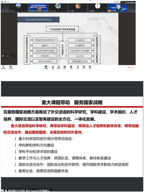 杨明星教授首先深刻分析了世纪疫情和百年变局交织叠加给中国特色大国外交话语权建设带来的严峻挑战。他认为在此背景下,外语人应主动担当,充分发挥自身语言优势,推动外语学科与中文学科、国际关系和新闻传播学科的交叉融合发展,以拓展外语学科的发展空间。他重点介绍了“外交话语学”,外交话语作为一种特殊的语言资源和文化软实力,具有独特的发展规律和跨学科属性,是构建国际话语权、提升国家形象的关键元素和重要载体。“外交话语学”学科体系创建是挖掘外语学科潜力、推进新文科建设和外语学科转型发展的一个重要突破口和关键路径。