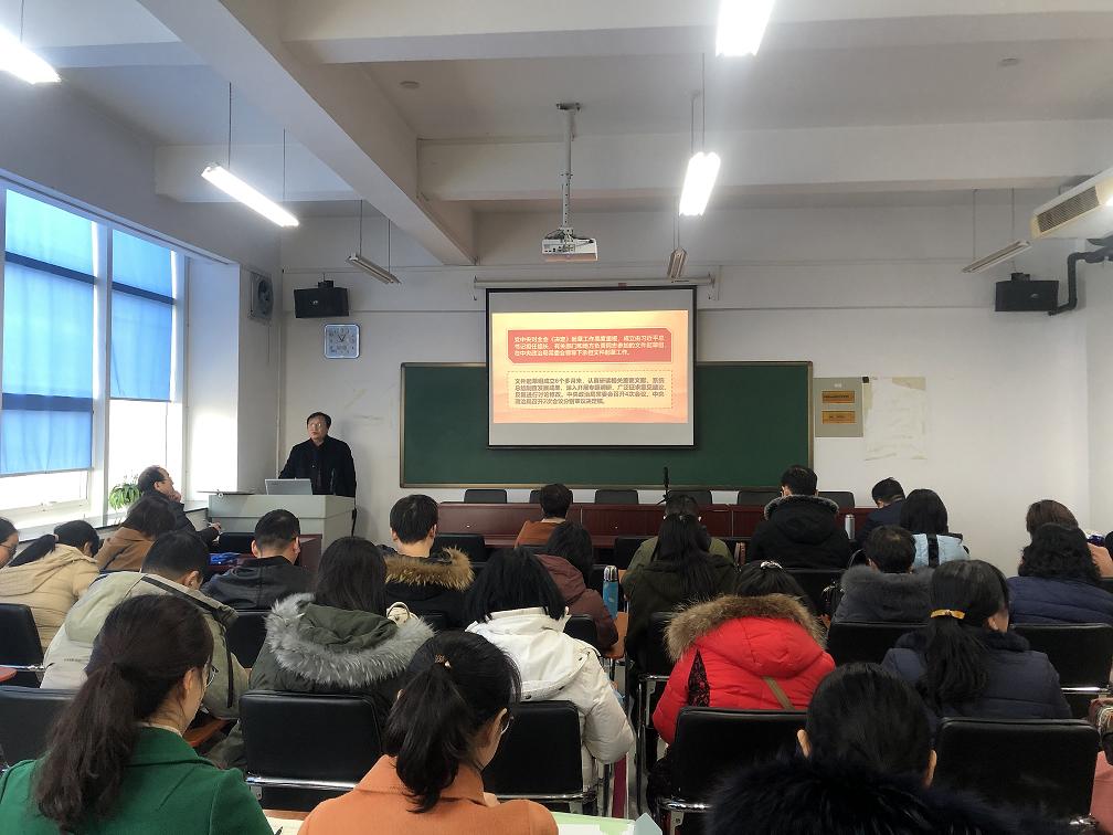 最后,王书记强调,学习宣传贯彻党的十九届四中全会精神,是当前和今后一个时期的重要政治任务。全体教师一定要提高政治站位,把十九届四中全会精神领会透彻,自觉将思想和行动统一到全会精神上来,要结合目前正在开展的课程思政改革,把全会精神有机融入到课堂教学中来,在宣讲我们的制度优势同时,扩展讲好中国故事、河南故事,使广大学子进一步增强“四个自信”、树牢“四个意识”、做到“两个维护”;王书记勉励大家,要始终秉持为党育人、为国育才的使命担当,坚持立德树人,同心戮力,为培养出更多的具有中国情怀,熟练掌握外语,通晓国际规则的德、智、体、美、劳全面发展的社会主义建设者和接班人,努力做出无愧于时代的光辉业绩。