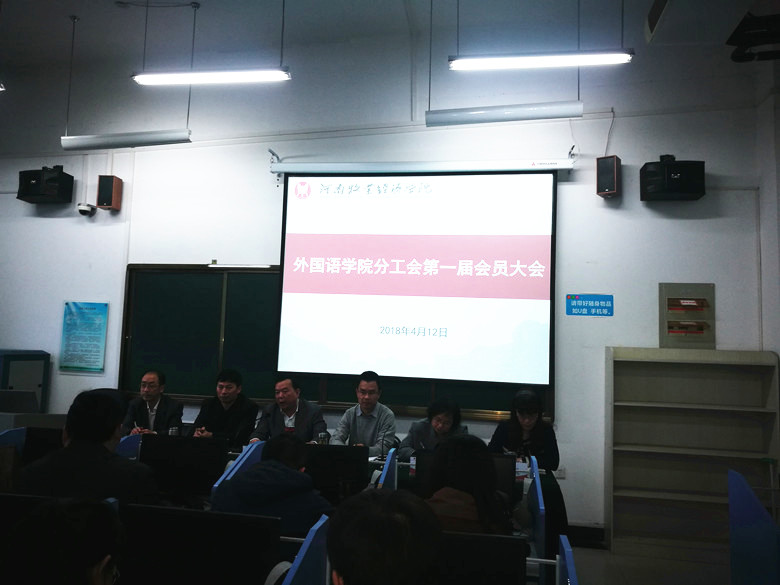 根据学校《关于建立健全分工会组织的通知》精神,米兰milan官方网站第一届分工会会员大会于4月12日下午在龙子湖校区外语实训中心521多媒体语音实验室召开。会议由院党总支书记弓峰山主持,院领导班子成员及全体教职工出席了会议。
