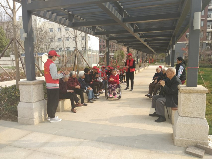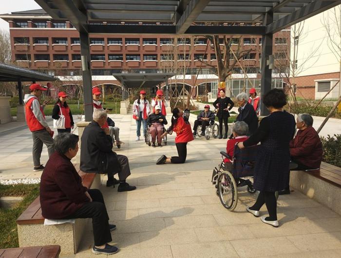 志愿者们到达敬老院后,先向敬老院的工作人员说明情况,询问院内有什么需要协助的工作。沟通结束后,志愿者们分为两队:一队帮助组织安排即将开办活动的现场,一队负责带领老人们晒暖、陪老人们聊天以及表演节目。三位志愿者的《同一首歌》拉近了与老人们心灵间的距离,老人与志愿者们讲述自己年轻时的生活,说到动情处还演唱那个年代的流行歌曲,让在场的所有同学们为之动容。同学们还为老人们表演美丽的民族舞,充分点燃了现场的气氛,全场一片和谐与温馨。最后,在志愿者合唱的“河南牧业经济学院校歌”歌声中圆满结束了此次志愿服务活动。