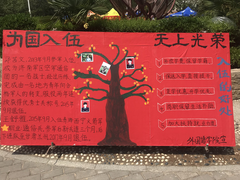 为了让同学们更好的了解参军入伍的政策,米兰官网绘制参军入伍展板,展示参军入伍的流程以及米兰官网退伍学生的风采。