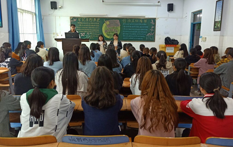 进入商务英语一班,同学们正在观看《我的1919》片段。青年们奔走抗议,最终中国代表没有出席巴黎和会的签字仪式。通过这个片段,同学们对五四精神有了更深刻的认识。应用英语二班的团支书带领大家演唱《我们走在大路上》,同学们个个站的笔直,声音洪亮。班长说:“我们作为新时代的青年,应积极学习五四精神,努力拼搏,争创时代先锋,为中华民族伟大复兴尽自己的一份气力!”台下掌声不断,同学们纷纷表示赞同。旅游英语二班的同学进行了有关五四精神诗歌的朗诵。“九十一年前的五四这一天,整个中华大地都为之震撼,热血青年高举‘德先生’与‘赛先生’,一场声势浩大的青年运动拉开帷幕。”一百年前的今天,“五四运动”这一伟大的爱国革命运动,拉开了新民主主义革命的序幕,而百年后的今天,作为新青年的我们,更应该弘扬五四精神,传承革命先辈们的优秀精神,为新时代的发展贡献自己的一份力量。