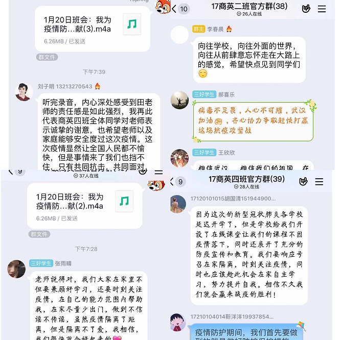 本次班会中同学们热情参与、积极讨论,对于本次疫情有了更加深入的了解,对于各个层面的通知要求有了更多的理解。大家纷纷留言表示一定会响应号召,一切听从指挥,并且认真参与线上学习,提高自主学习能力,准备更好的自己,为社会做出更多的贡献。同时同学们也表达了很多自己的想法,也为米兰官网学生工作队伍有针对性地持续开展工作提出了新的要求和努力方向。