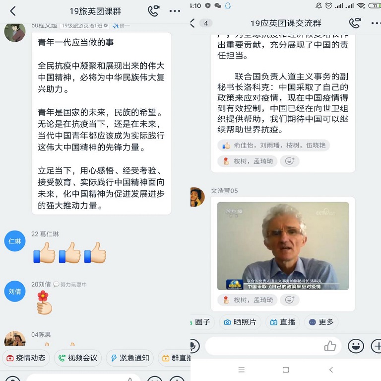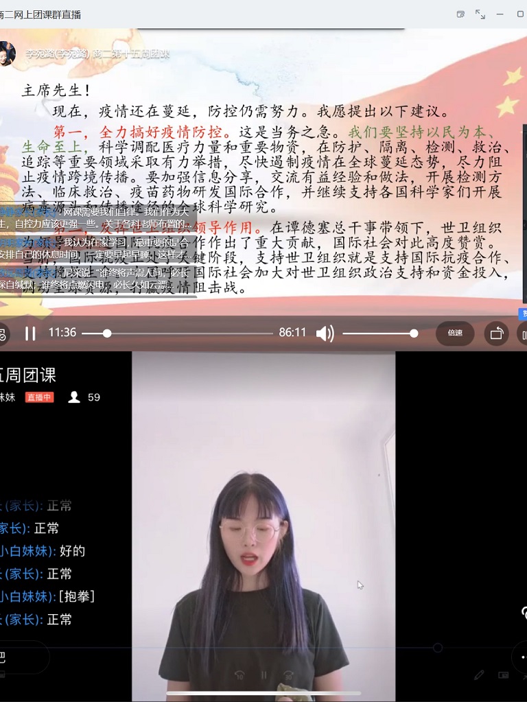 团课上,各班通过视频和PPT等方式习了习近平总书记在第七十三届世界卫生大会上的讲话内容,并了解到我国在自身疫情防控的同时助力其他国家,共同抗疫,展现了中国的担当精神。19级商务英语一班团支书给大家播放了《相信年轻的力量》《抗疫一线的青年力量》和《致敬抗疫一线》等视频,向同学们展示了青年一代的力量,当代青年的担当与奉献精神,激起了同学们的社会责任感。19级商务英语三班的李润珂同学关于习近平总书记的讲话进行了饱含感情的心得分享。19商务英语三班心理委员郝佳慧同学这样说到:“这场看不见硝烟的战争,是对国家危机反应能力,社会动员能力的考验,更是对我们国家制度的考验,此次新冠疫情充分证明了我们国家制度的优越性,我们也应该坚定制度自信,严谨自律做好学业、职业规划,保持良好的精神面貌。” 话音刚落,同学们在直播间里纷纷送上“小红花”,纷纷为她的发言点赞。