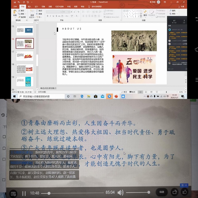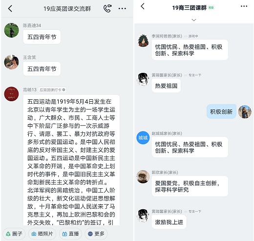 团课上,各班分享了习近平总书记的五四寄语。通过微博、知乎、学习强国等不同新媒体工具回顾五四相关的知识内容,并学习了当代青年奋斗在战役一线的事迹。19级商务英语一班的徐晓翠同学关于寄语精神进行了三分钟饱含感情的心得分享,同时作为班级团支部的宣传委员,她这样说到:“我会积极组织同学们学习习近平总书记寄语内容,把总书记的关心关怀和重要要求传达到每一名团员。学习、继承和发扬五四精神,积极开展爱党爱国和制度自信教育。学习先进典型,用榜样力量教育团员青年崇尚先进、学习先进、争当先进。”19级商务英语二班团支书带领同学们观看了电影《建党伟业》的片段,生动再现历史场景,激励起了同学们内心深层次的社会责任感和家国情怀。