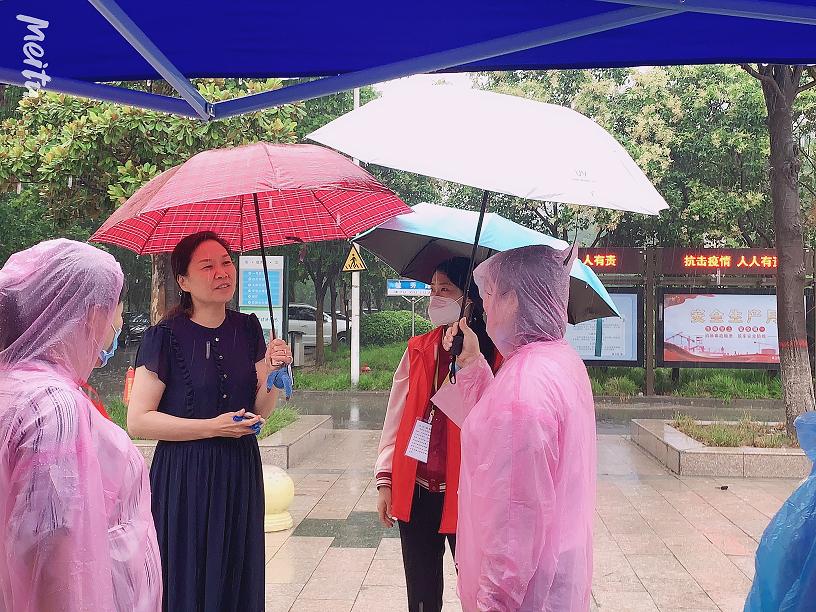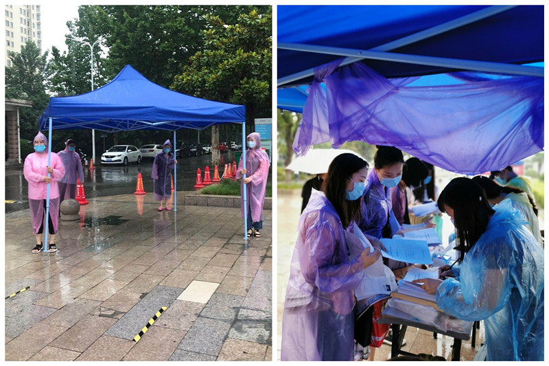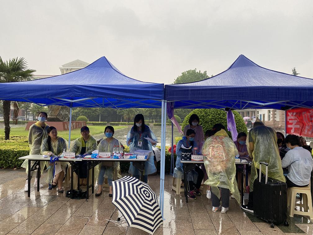 早上6点多,老师们就已从龙子湖校区赶到英才校区。冒着大雨,副书记李燚带领辅导员老师搭帐篷、抬桌子、准备发放材料,迎接工作分工明确,有条不紊。学生按照学校要求依次扫码入校,到达学院接待处。现场老师进行信息登记、检查收取“三单一书一表”、发放宿舍门卡、防疫物资、雨具和毕业纪念品。大雨倾盆,老师们不辞辛苦,坚守岗位,同学们倍感温暖和感动。