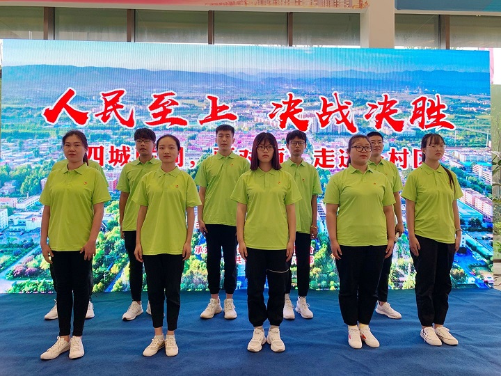 在“思源·星火”返乡大学生志愿活动授旗仪式现场,程文超接过授予他们的旗帜,坚定了踊跃投身疫情防控、复工复产复学一线的决定。“不畏艰险、冲锋在前,展现了当代青年的担当”,这是给与他们这支队伍的评价和认可。在“四城联创”决战攻坚的重要关口,他又一次站出来,走进农村社区,带领志愿队伍开展志愿服务,助力四城联创,拍摄文明城市短视频,用实际行动践行着“热爱马村 回报家乡 为打造焦东新城 贡献青春力量”的誓言。出色的表现让他有机会参与“四城联创”面对面座谈会电视节目拍摄并代表全体大学生志愿者宣誓。
