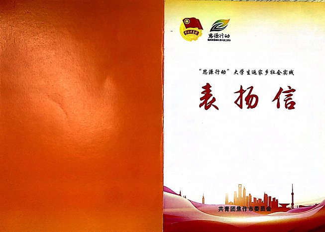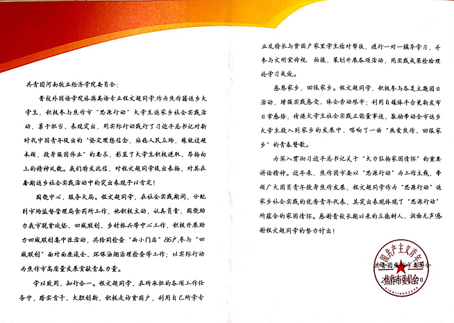 近日,共青团焦作市委员会发来表扬信,对米兰milan官方网站2019级旅游英语专业学生程文超在焦作市“思源行动”大学生返家乡社会实践活动中的突出表现予以表扬和感谢。
