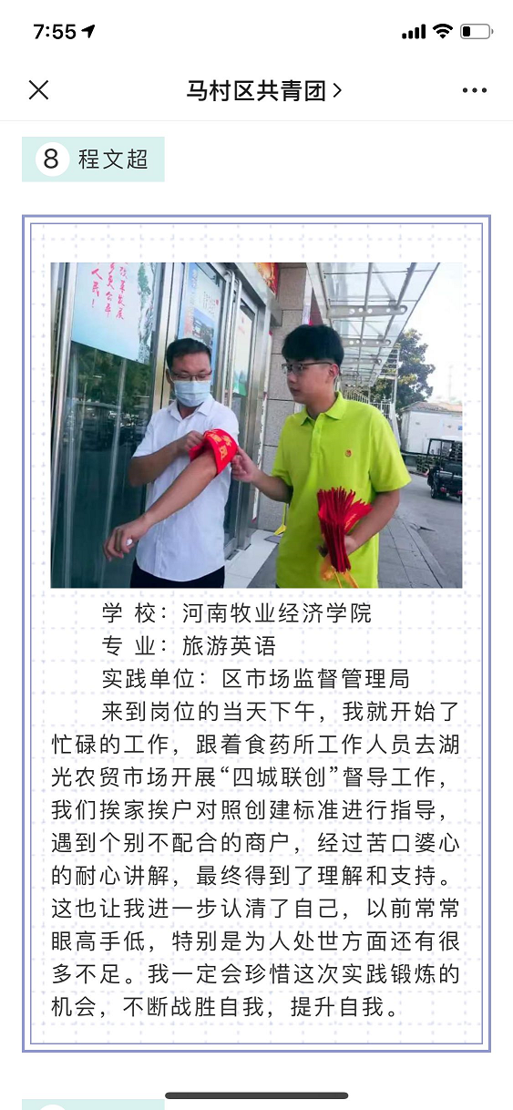 程文超同学响应号召,积极参与焦作市马村区返乡大学生志愿活动。在市场监督管理局食药所进行实践活动期间,积极主动,认真负责,围绕助力焦作市脱贫攻坚、四城联创、乡村振兴等中心工作,积极开展助力四城联创集中性活动,共陪同检查“两小门店”86户,参与“四城联创”面对面座谈会、环保油烟治理检查等工作。积极走访贫困户,利用自己所学专业及特长与贫困户家里学生结对帮扶,进行一对一辅导,并参与文明宣传视频拍摄。利用自媒体平台更新发布日常感悟,传递大学生社会实践正能量,以实际行动为焦作市高质量发展贡献青春力量。