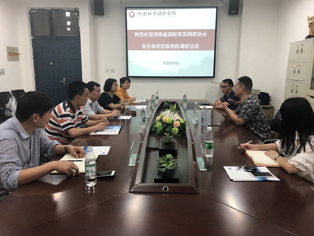 5月16日下午,河南省国际贸易网商协会秘书长王毅、河南安德在线电子科技有限公司总经理黄敬银、总经理助理杜洋莅临米兰官网调研洽谈,米兰milan官方网站领导班子成员出席会议。