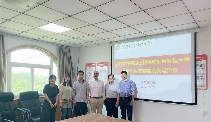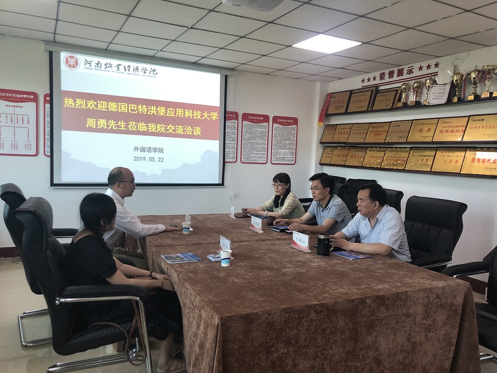5月22日下午,德国巴特洪堡应用科技大学校方代表周勇先生到米兰官网交流洽谈。米兰milan官方网站党总支书记弓峰山、院长陈延潼会见了来访客人,双方就相关合作意向进行了座谈。米兰milan官方网站副书记陈东景、副院长马媛媛及教师代表参加座谈。