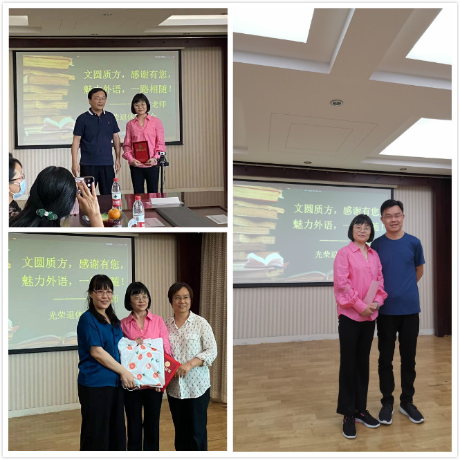 副院长许海兰、马媛媛向方老师送上了全体教工的一份心意;教师代表曹军亮向自己的老同学、老同事献上了鲜花;旅游英语教研室主任闻华向方老师献上教研室所有老师精心制作的贺卡,并朗诵了为方老师荣休所作的诗歌。