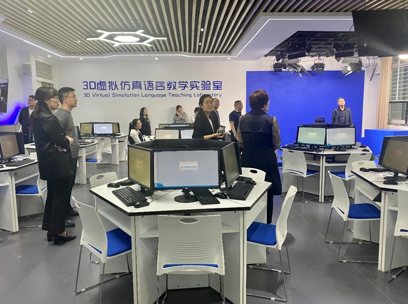 在马媛媛院长的陪同下,雷院长一行参观米兰官网虚拟仿真语言学习中心并实景体验了各项功能的使用。